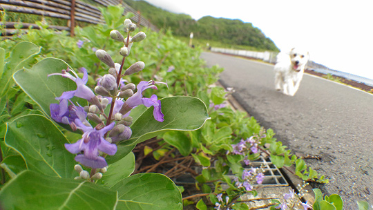 海岸の散歩にも持って出かけてみました。今、海辺では「ハマゴウ」という海浜植物が、小さくて薄紫色の花をたくさん咲かせています。